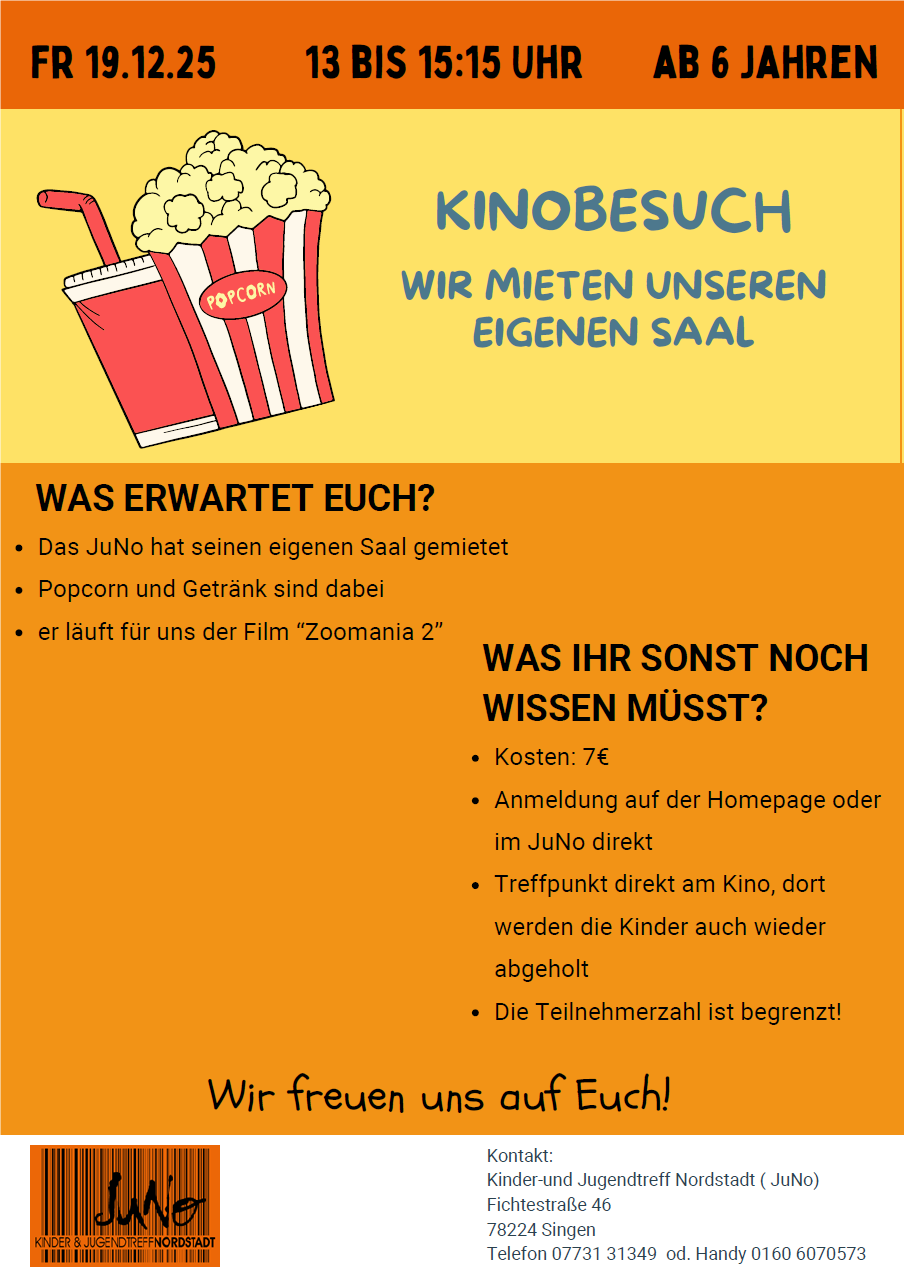 Nach dem Ausflug ins Kino hat das JuNo Weihnachtsferien bis einschließlich 06.01.2026. Ab dem 07.01.2026 ist das JuNo-Team wieder wie gewohnt für euch da! Alle Infos auf der Homepage oder direkt im JuNo.